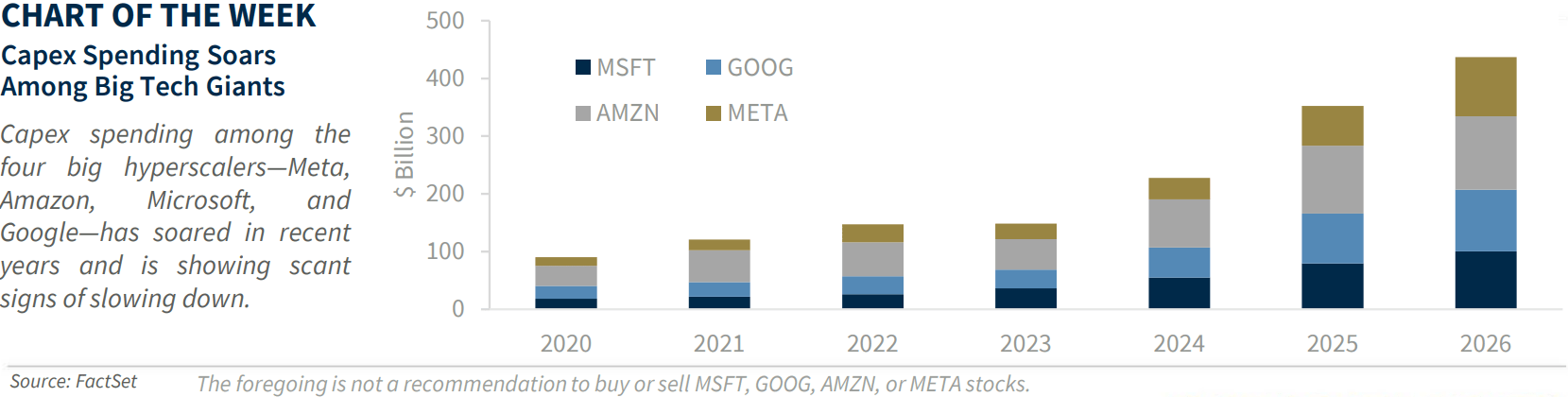 - How Long Can AI Capex Remain ‘Enchanting’? | AI-related capital spending is surging. Aggregate capex for the four big hyperscalers— Meta, Amazon, Microsoft, and Alphabet—has jumped from $149 billion in 2023 to roughly $430 billion in 2026, nearly tripling over the last few years. While growth may moderate, spending should remain strong. This was reinforced by this week’s mega-cap earnings reports, which confirmed the AI boom is alive and well as demand continues to outpace supply—particularly reflected in upbeat cloud revenue guidance. The data center buildout is also driving additional investment in power infrastructure.