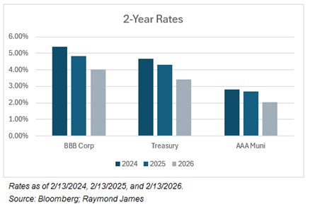 Investment goals can be just as important. A short time horizon is a common investment goal for needs such as a child entering college, a down payment on a home, or an ultra-conservative risk tolerance. These are all different reasons investors may arrive at the same investment decision. Right now, the short end of yield curves across multiple asset classes offers relatively little additional yield, or reward, over Treasuries. The consequences of this affect all investors, regardless of their individual characteristics and tax rates. If liquidity, credit quality and call protection are paramount to a short-term investor, Treasuries may be the most appealing choice. Current rates on the short end mean the highest credit quality option does not sacrifice as much yield as it may have in the past.